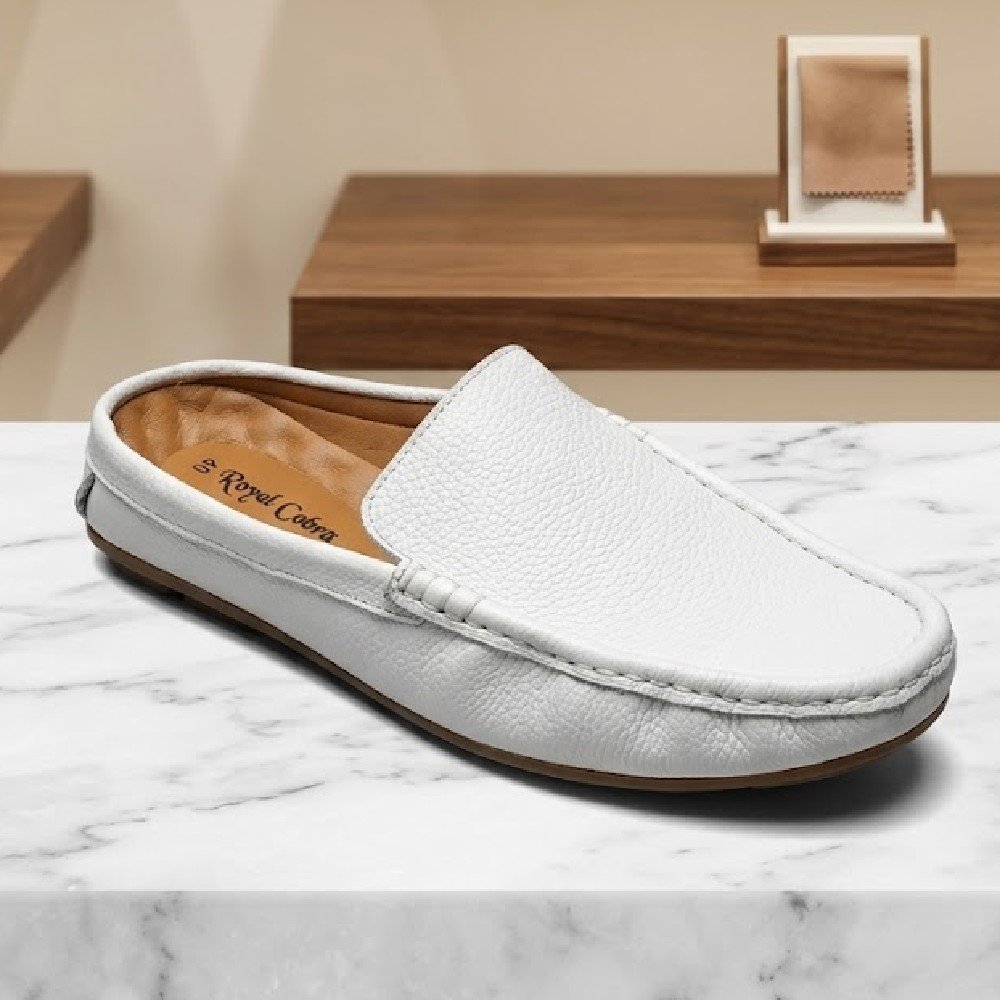 STEP INTO COMFORT AND STYLE WITH THESE WHITE HALF LOAFERS. DESIGNED WITH A TRANSFERRED SOLE FOR DURABILITY, A DOCTOR INSOLE FOR EXTRA COMFORT, AND A LEATHER INNER UPPER FOR A PREMIUM LOOK. PERFECT FOR CASUAL AND FORMAL WEAR.